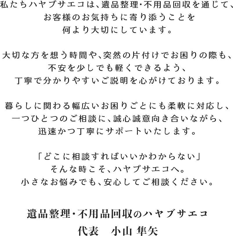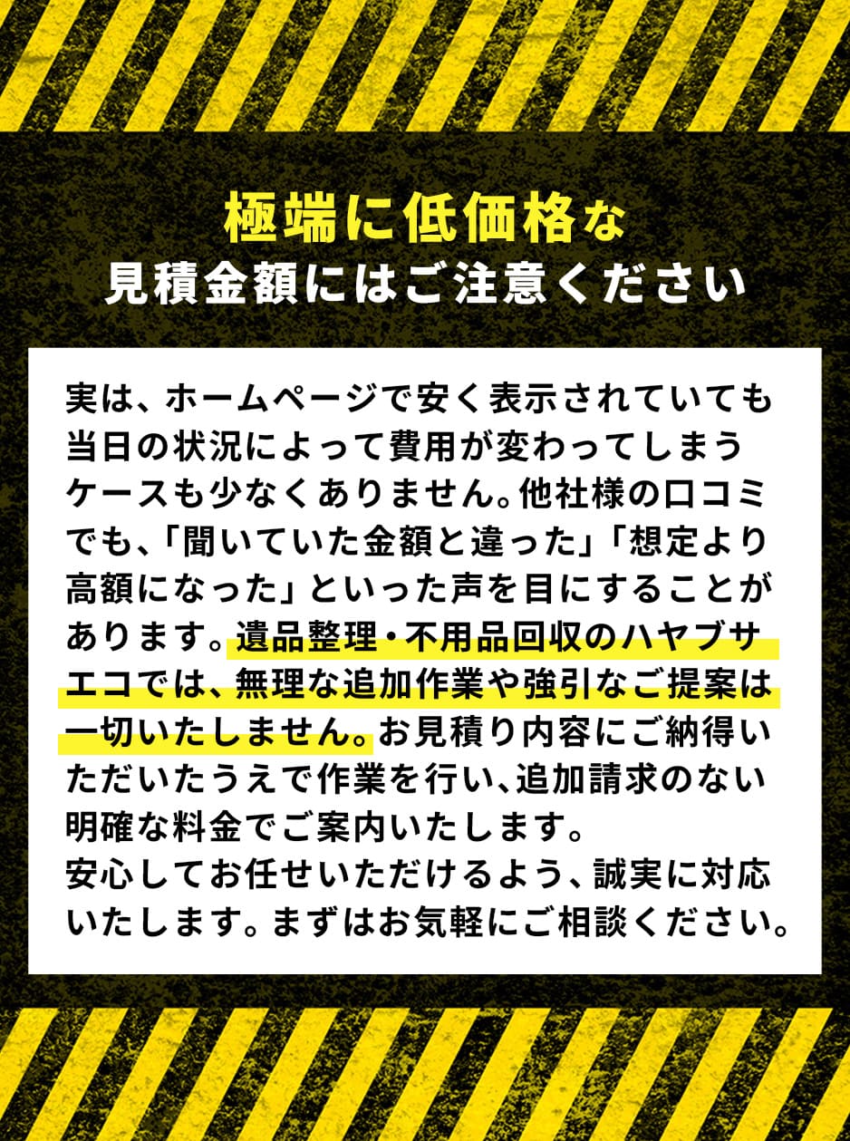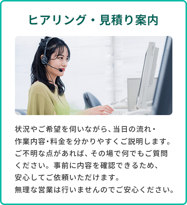 ハヤブサエコでは、見積もり内容を確認したうえでご検討いただくことを大切にしています。ご納得いただけない場合に、無理に契約を迫ることはありませんので、安心してご相談ください。
