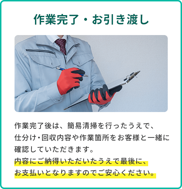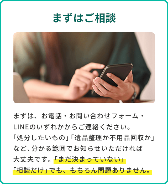 回収したい物の内容や量、ご希望の日時などをお伝えいただければ、こちらから必要な確認を行います。「うまく説明できない」という方も多いので、ご安心ください。