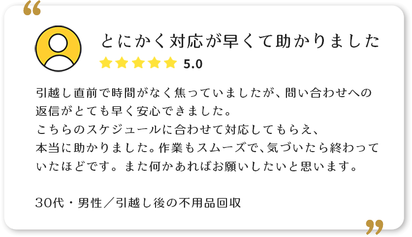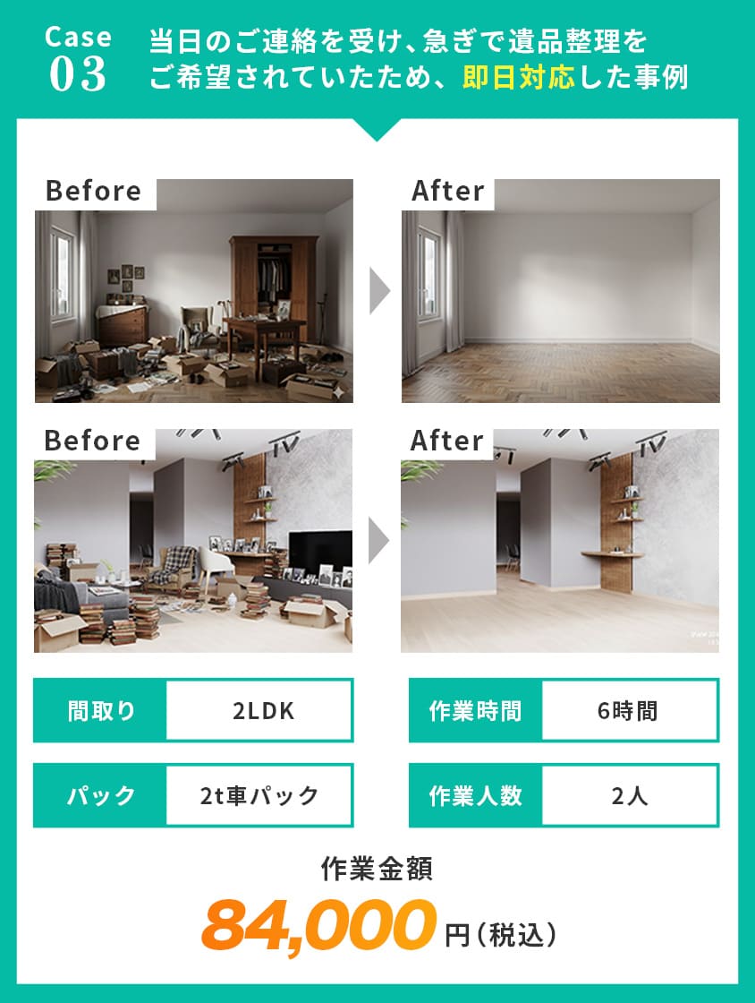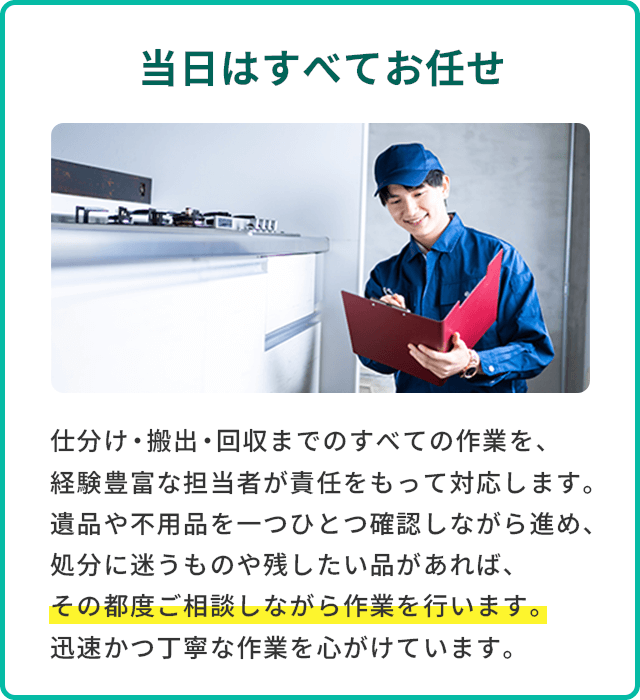 少量の回収であれば短時間で終わることもありますし、お部屋全体の場合は半日〜数日かかるケースもあります。スケジュールに配慮しながら進めます。