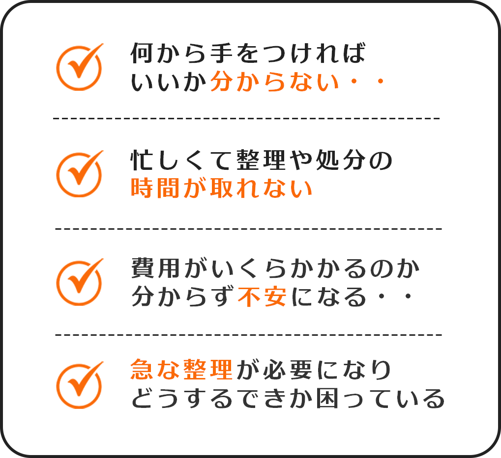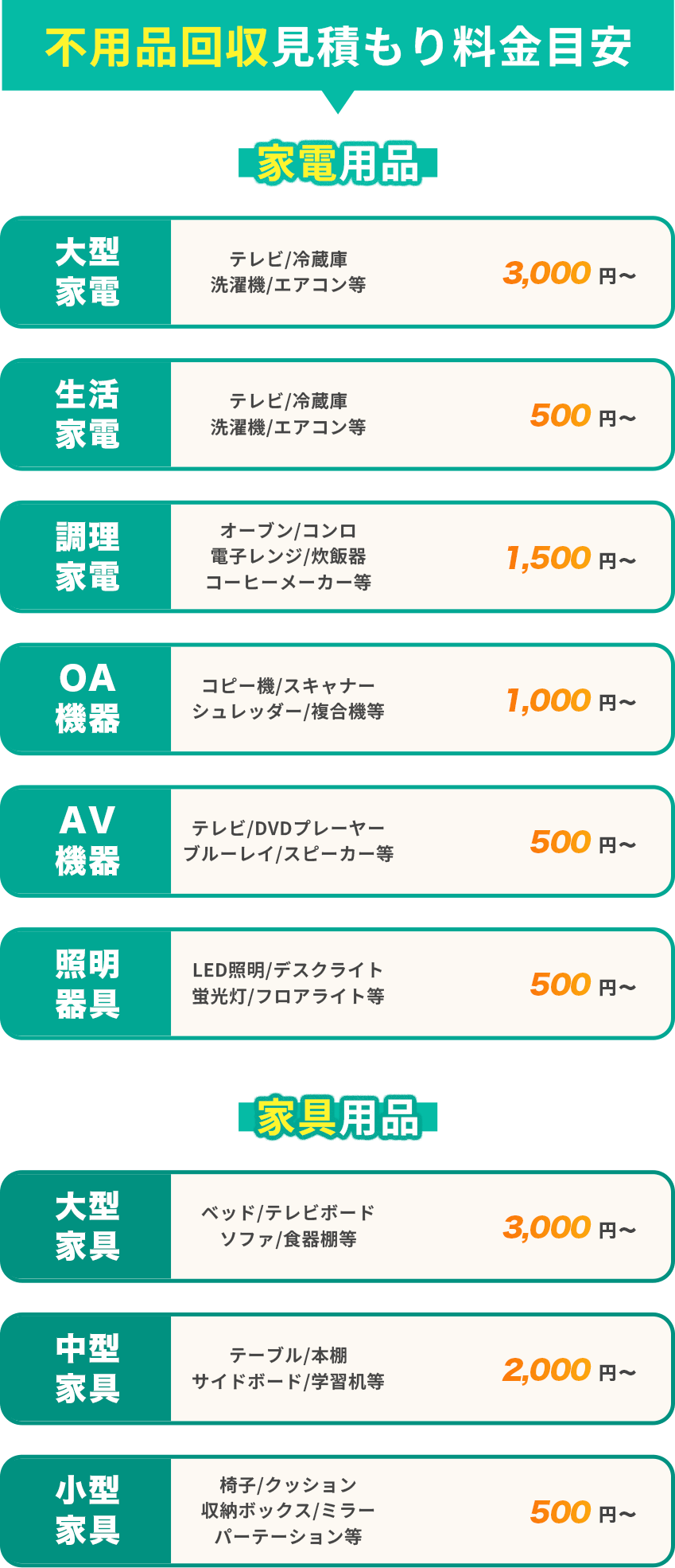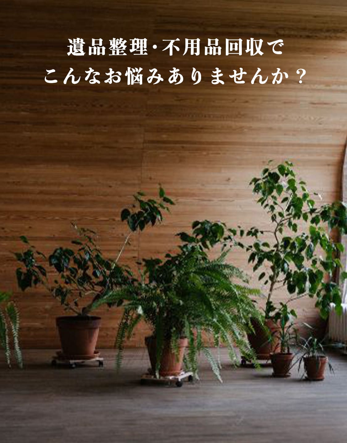 小さな家電や家具1点のみといった少量回収から、引っ越し・遺品整理・空き家整理などの大量の不用品回収まで幅広く対応しています。室内に不用品がまとめられていない場合や、種類が混在している状態でも問題ありません。