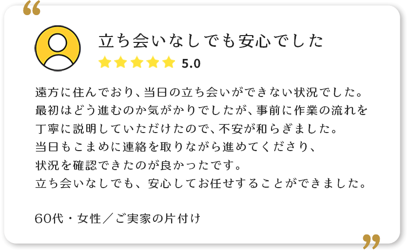 お電話や写真、メッセージで状況を共有いただければ、目安となる金額をお伝えすることも可能です。正確なお見積もりが必要な場合は、現地確認後にご案内しますが、事前に費用感を知りたいというご相談も歓迎しています。
